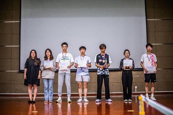 羽毛球馆内同学们挥汗如雨,隔网“厮杀”,一招一式尽显专业,“十八般武艺”令人眼花缭乱;赛场下,大家为同学和队友欢呼加油,比赛氛围热烈。在紧张刺激的正赛之外,部分专业过硬的学生还进行了表演赛,同时老师和同学们也自由组队在空闲场地进行练习,大家在欢声笑语中增进了彼此的友谊。