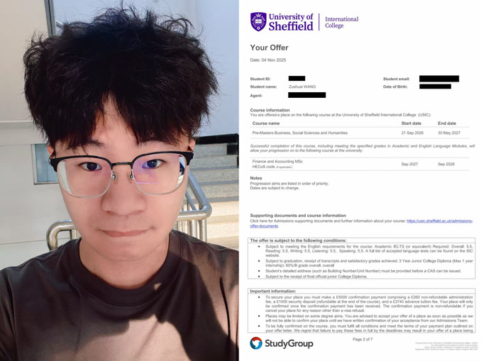 近日,数字经济与管理学院海外升学版图再添新彩!作为我校2025年首批“海外升学”项目的又一名优秀学子,来自工商企业管理2302班的王祖帅同学,凭借扎实的专业知识储备、出色的跨文化沟通能力与清晰的学术规划,成功斩获QS 2026世界第 92位 英国名校——谢菲尔德大学的预录取通知书,不仅延续了我校“海外升学” 项目的升学佳绩,更为全校有志于海外深造的学子树立了“精准规划、稳步提升” 的优秀典范!