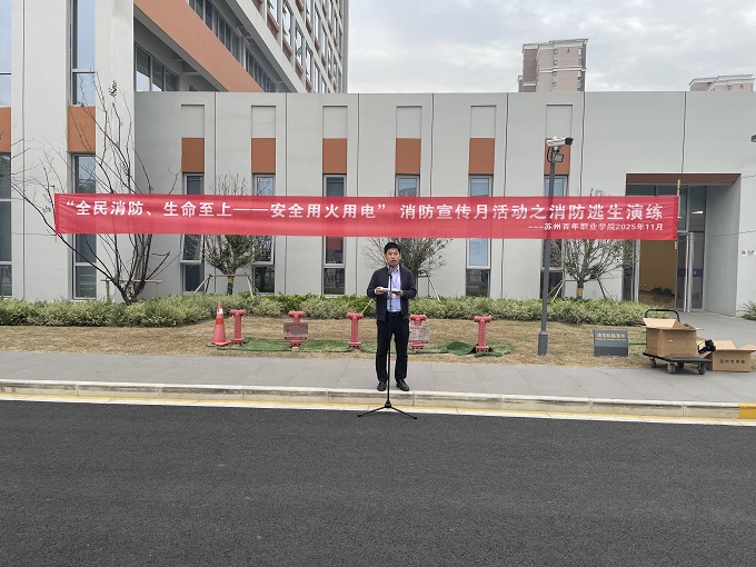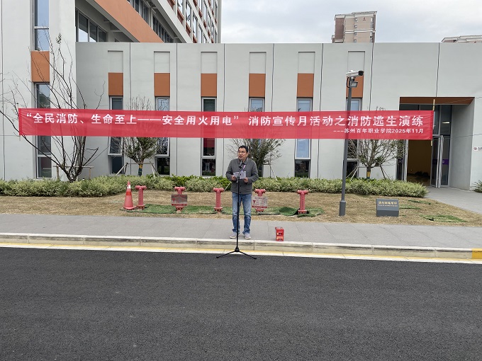 为迎接第34个全国消防日,深入贯彻落实"全民消防、生命至上——安全用火用电"的消防宣传月主题,苏州百年职业学院于2025年11月4日成功举办了年度消防应急疏散演练活动。此次活动由校长助理袁祥担任总指挥,学生事务部(安全保卫部)胡赛主任统筹组织,独墅湖消防中队官兵、各二级学院辅导员、学生代表以及学校警务室人员、物业保安、食堂工作人员共同参与。
