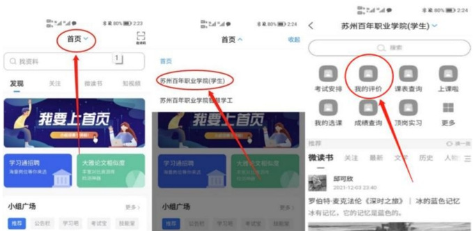 打开超星“学习通”APP,而后按照下图步骤进行操作。评价选、填完成后,点击保存;全部课程的评价都保存后,再点击提交,提交后才算完成评教。