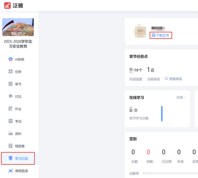 4.证书下载:登录超星平台,进入2025-2026学年实习安全教育”课程点击“学习记录”,选择“下载证书”。