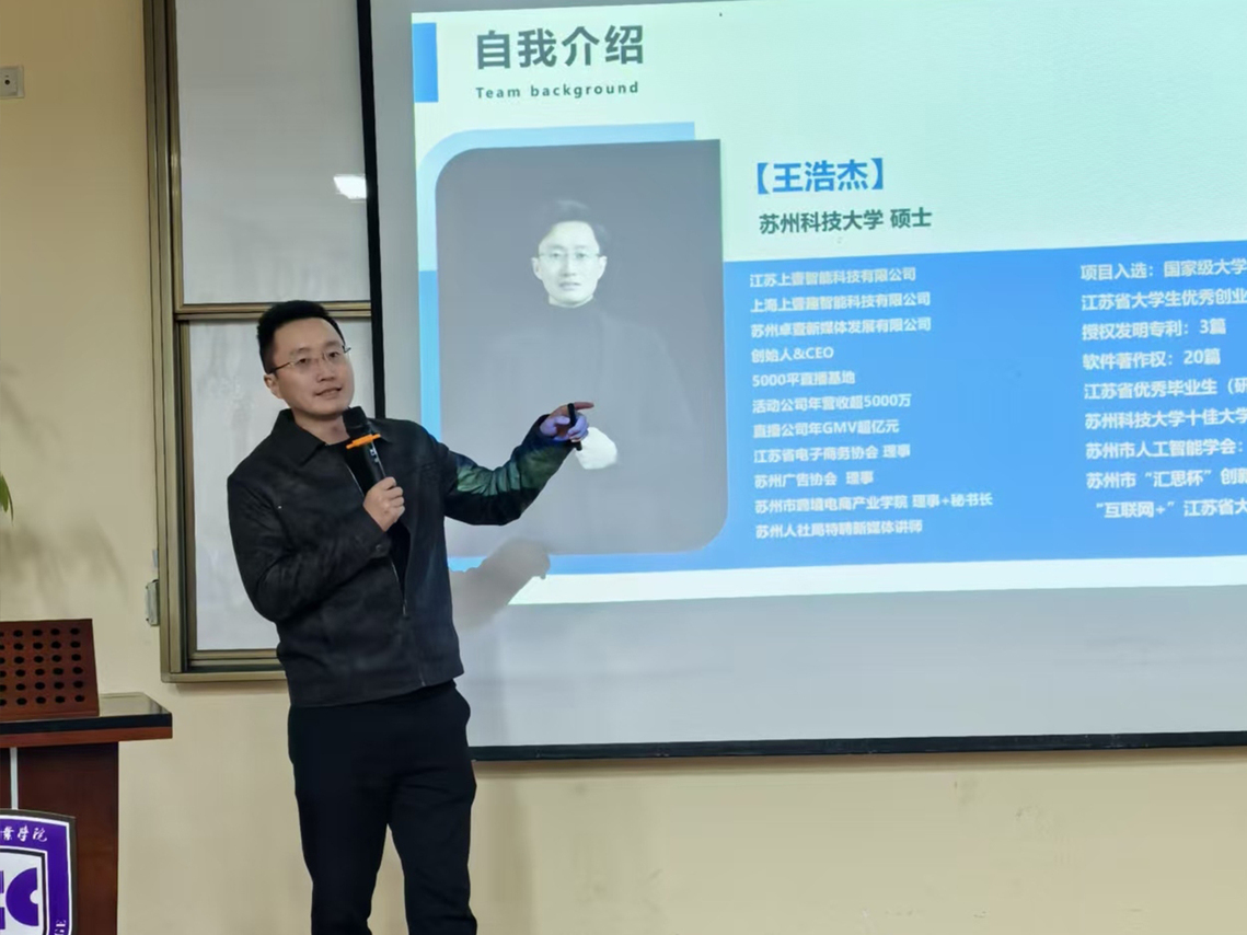 2025年11月13日,江苏上壹智能科技有限公司走进苏州百年职业学院,面向艺术与创意设计学院学生举办了一场以“从校园到职场的全链路人才成长路径”为主题的校企合作招聘宣讲会。宣讲会由艺术与创意设计学院副院长程向帅主持,江苏上壹智能科技有限公司创始人王浩杰担任主讲嘉宾。