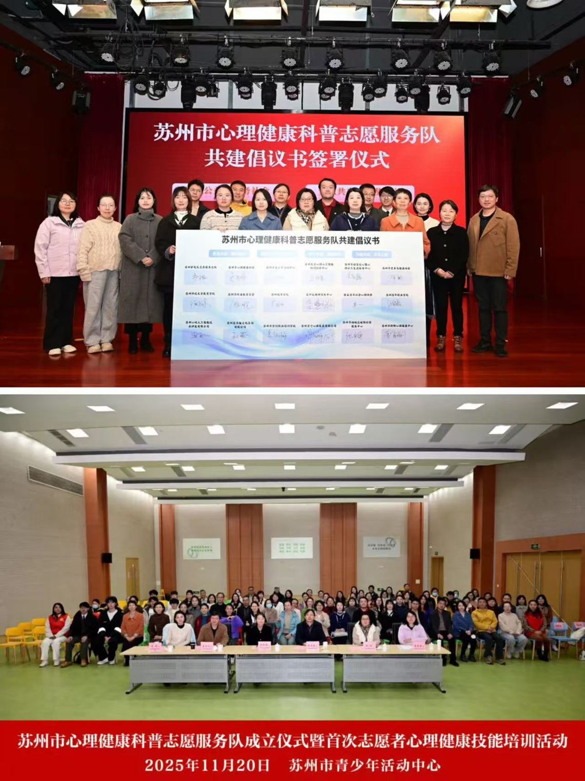 2025年11月20日,数字经济与管理学院应邀参加“苏州市心理健康科普志愿服务队成立仪式暨首次志愿者心理健康技能培训”,与20余家高校、医疗机构及社会组织代表齐聚苏州市青少年活动中心,共同见证这一推动社会心理服务体系建设的重要时刻。