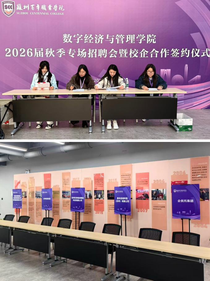 为精准对接毕业生就业需求与企业人才招聘痛点,深化产教融合长效机制,苏州百年职业学院数字经济与管理学院精心筹备,于2025年11月19日成功举办“数智赋能·产教融合——2026届秋季专场招聘会暨校企合作签约仪式”。活动以“全流程闭环服务、多环节精准联动”为特色,吸引 20 余家优质企业齐聚,500多名毕业生踊跃参与,实现了人才供需的高效匹配与校企合作的深度升级。