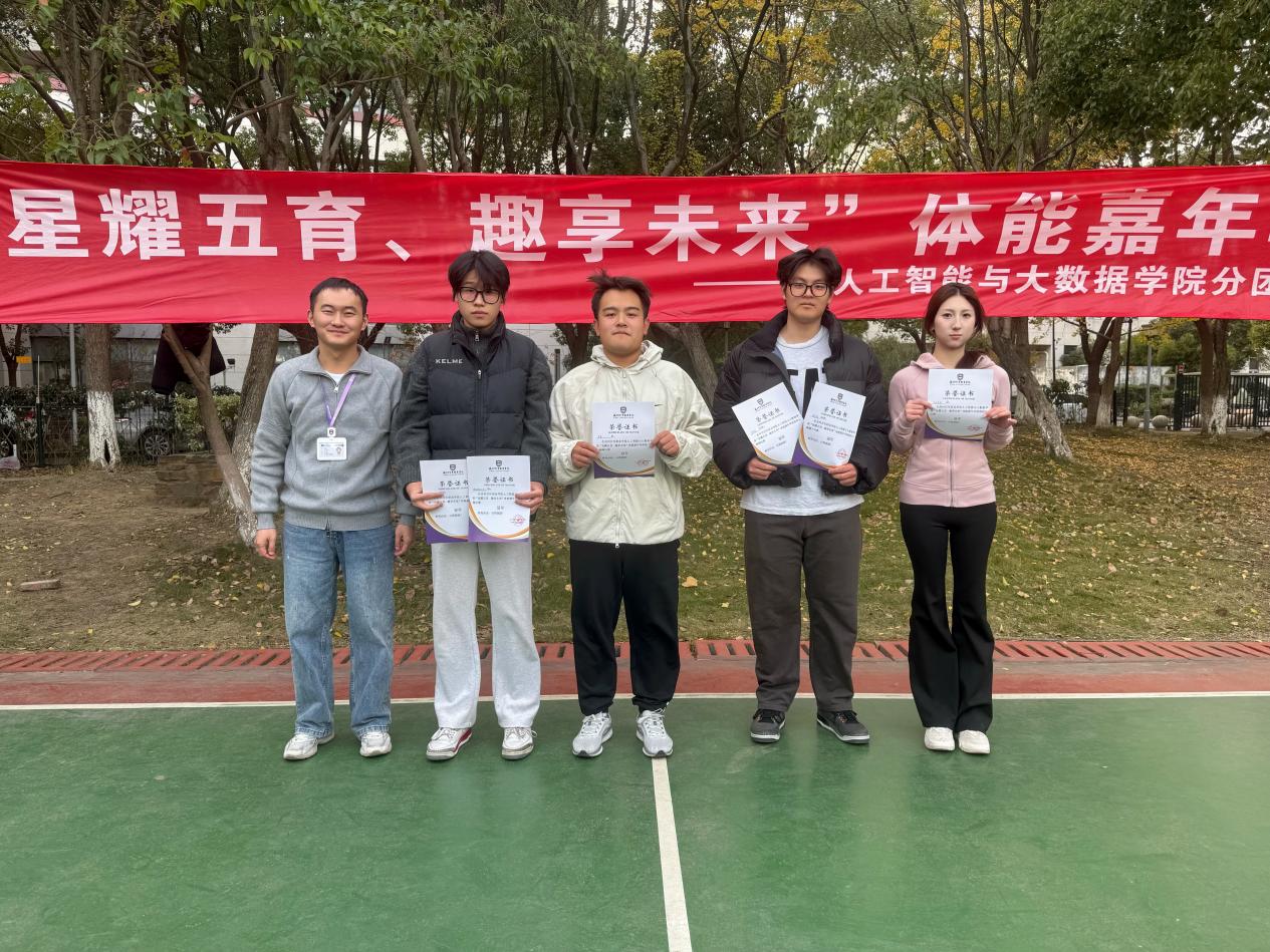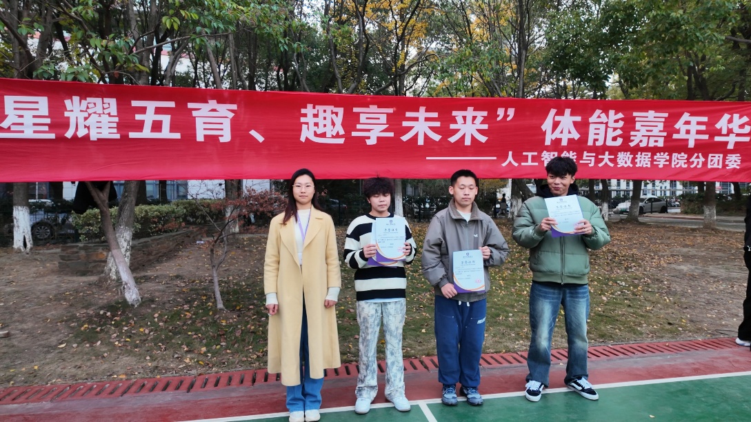 “星耀五育、趣享未来”体能嘉年华活动不仅是一次成功的体能锻炼与趣味竞赛,更是一堂生动的“五育并举”实践课。参赛选手和获奖同学们脸上洋溢着自豪与喜悦的笑容,手中荣誉证书不仅是对运动成绩的肯定,更是对他们拼搏精神与团队荣誉感的最高褒奖。人工智能与大数据学院将继续创新育人形式,搭建多元平台,助力每一位学子成长为体魄强健、精神充盈、能力卓越的复合型人才,以最饱满的姿态迎接新时代的挑战。