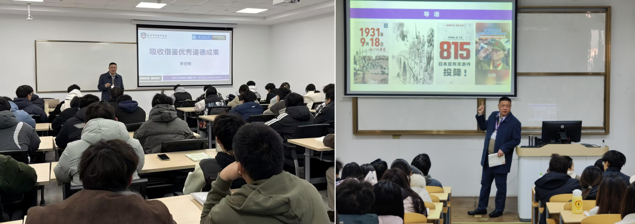 校长李世明深入教学一线,为工商企业管理、国际金融专业学生讲授题为《弘扬伟大抗战精神 砥砺奋进新征程——纪念中国人民抗日战争暨世界反法西斯战争胜利80周年》的形势与政策课,引导学生铭记历史、珍爱和平、勇担时代重任;同时,他还为软件技术(3+2)班学生讲授《思想道德与法治》第五章“遵守道德规范 锤炼道德品格”的部分内容,强调青年学生要明大德、守公德、严私德,在日常生活中涵养高尚道德情操。