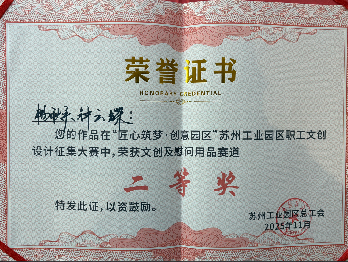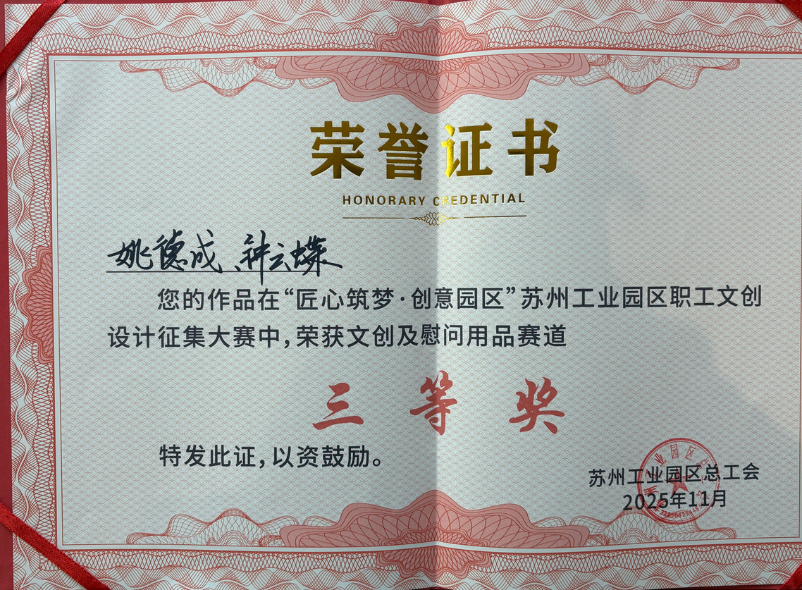 近日,由苏州工业园区总工会主办、苏州阳澄湖半岛文化科技有限公司承办的“匠心筑梦·创意园区”苏州工业园区职工文创设计征集大赛圆满落幕。我校学子杨秋平、姚德成在指导老师钟云蝶的悉心指导下,凭借扎实的专业功底与新颖的创意构思,共有三件作品从众多参赛作品中脱颖而出,斩获重要奖项,累计赢得近万元比赛奖金。