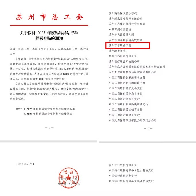 近日,苏州市总工会公布2025年度“妈妈驿站”专项经费补贴拨付名单,我校工会“妈妈驿站”项目成功入围,是全市获此支持中仅有的两所高校之一。这标志着我校在关爱女职工实际需求、注重创新服务、传递学校温情等方面的工作取得实质成效和高度认可。