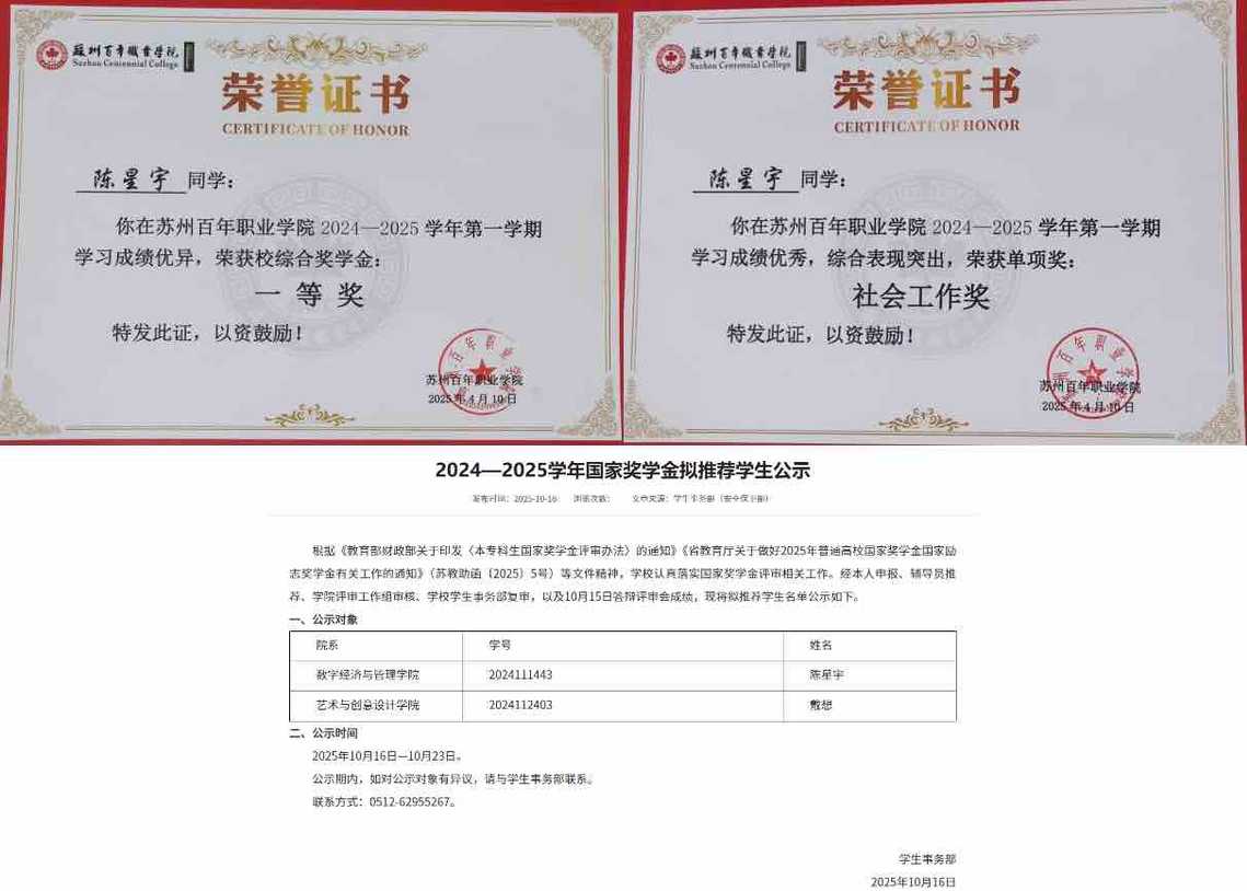 在苏州百年职业学院的校园里,国际经济与贸易2402班学生陈星宇的名字始终与“责任”“拼搏”“担当”紧密相连。从踏入校园时的青涩,到如今,身兼学院学生会主席、校团委社团管理部部长、班级班长、电竞社负责人数职的他,以实际行动诠释着新时代大学生的青春担当,凭借优异的综合表现斩获2025年度“国家奖学金”,成为师生眼中的榜样。