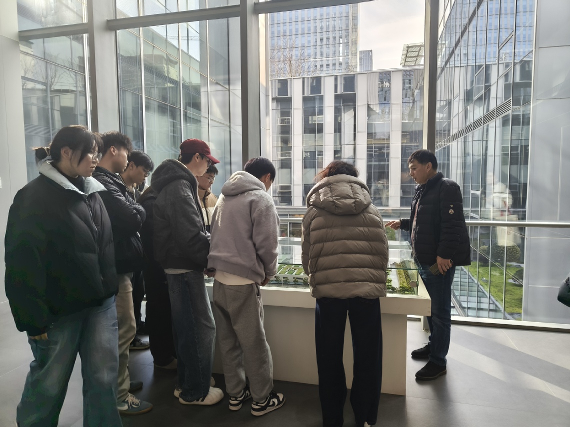 活动伊始,在车伟的带领下,师生们实地参观了启迪大楼。车伟结合大楼的空间布局、功能分区、材料运用及美学设计等方面,详细讲解了建筑设计的核心理念与特色亮点,从兼具辨识度与实用性的入口形象区,到兼顾协作与私密的办公空间,再到适配多元需求的多功能区域,每一处细节都让学生们直观感受到室内设计在实际项目中的落地应用,对专业设计的实际价值有了初步认知。同时,车伟还向师生们介绍了启迪设计的发展历程、核心业务领域、行业影响力及经典项目成果,让学生们对室内设计行业的发展生态与职业前景有了全面了解。
