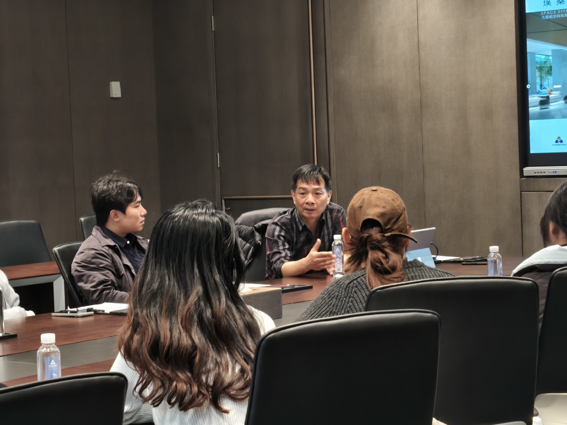 随后,师生们移步至会议室,开展专题学习分享。车伟以多个经典室内设计项目为蓝本,生动细致地讲述了项目从前期需求调研、创意方案构思、设计方案深化,到施工配合、质量把控直至最终验收的全流程。分享过程中,车伟结合项目推进中的实际难点与解决方案,深入剖析了设计工作中的核心要点、技术规范及职业素养要求,将抽象的专业知识转化为具象的实践案例,让学生们对室内设计专业的学习方向与工作逻辑有了清晰认知。