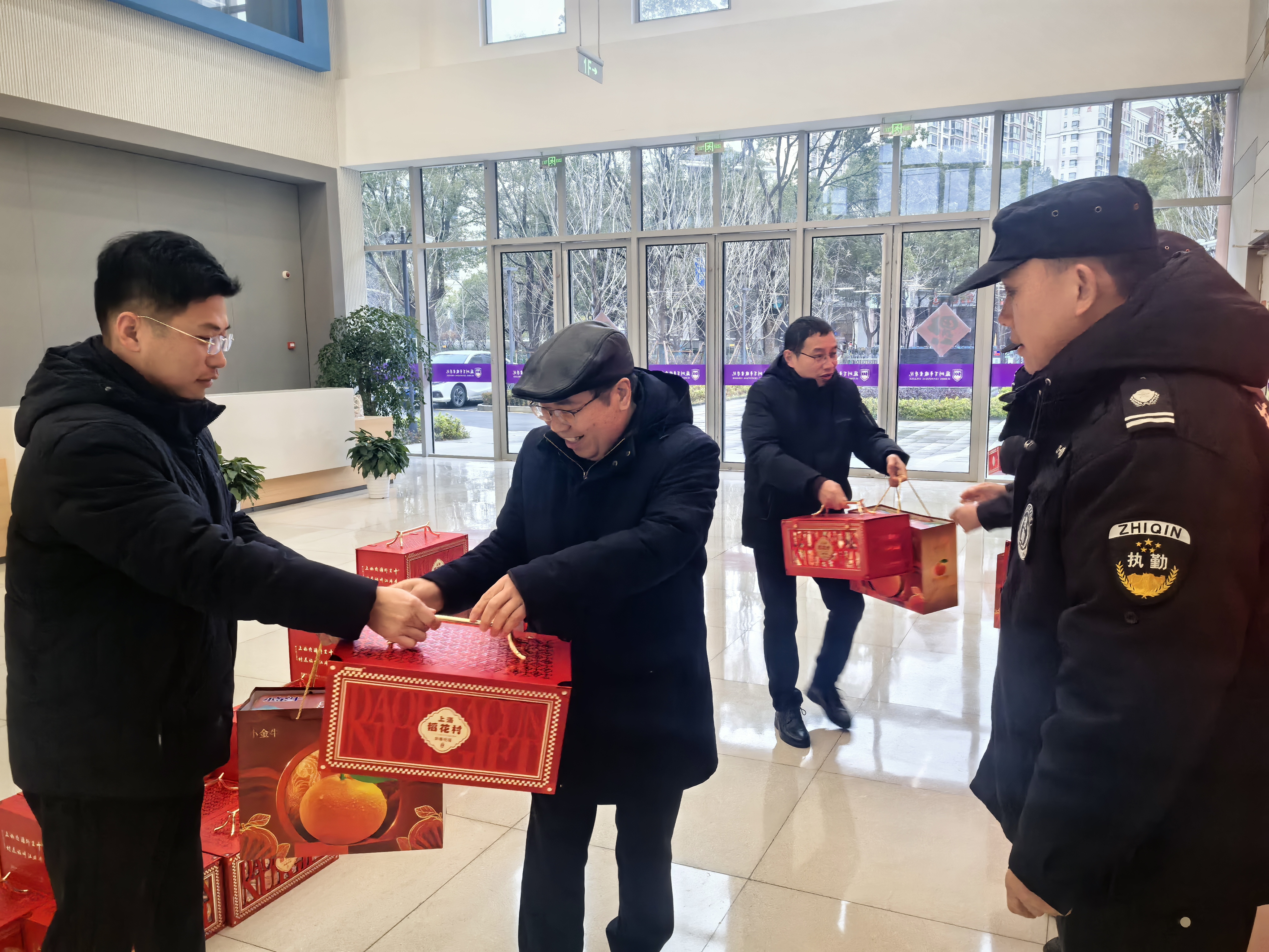 校领导们先后前往物业办公室、校园监控中心、消防控制中心及各门卫值守岗亭。每到一处,都与在岗人员亲切交流,详细询问并深入了解春节期间校园安全保卫工作部署、后勤服务保障具体安排等情况。校领导们亲手将精心准备的新年礼包递到每位坚守者手中,传递着学校的深切关怀。