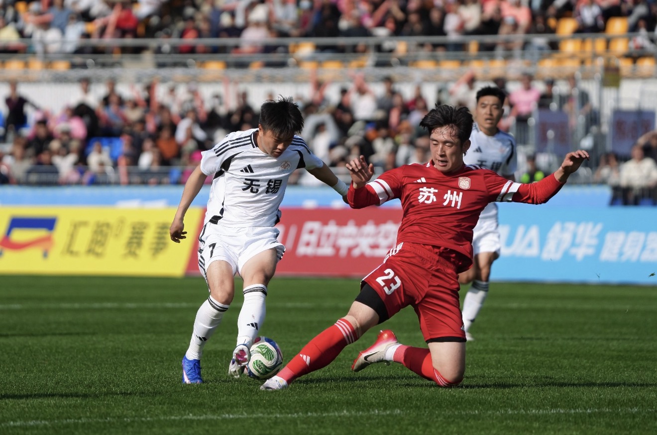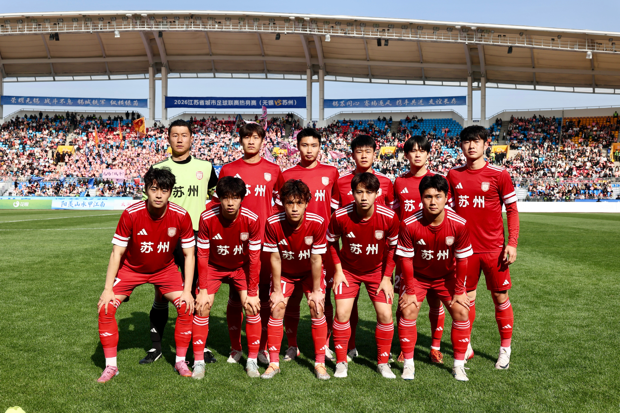 3月28日,2026年江苏省城市足球联赛热身赛在宜兴市体育中心体育场激情开赛,苏州队客场对阵无锡队。我校足球队队长、数字经济与管理学院2023级学生麻轩瑞身披23号球衣代表苏州队首发出战。热身赛现场共有20059名球迷观战,比赛氛围热烈,看台上不时响起阵阵助威呐喊声,旌旗招展,鼓点激昂。