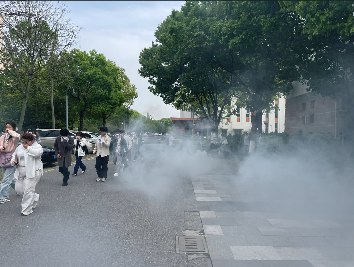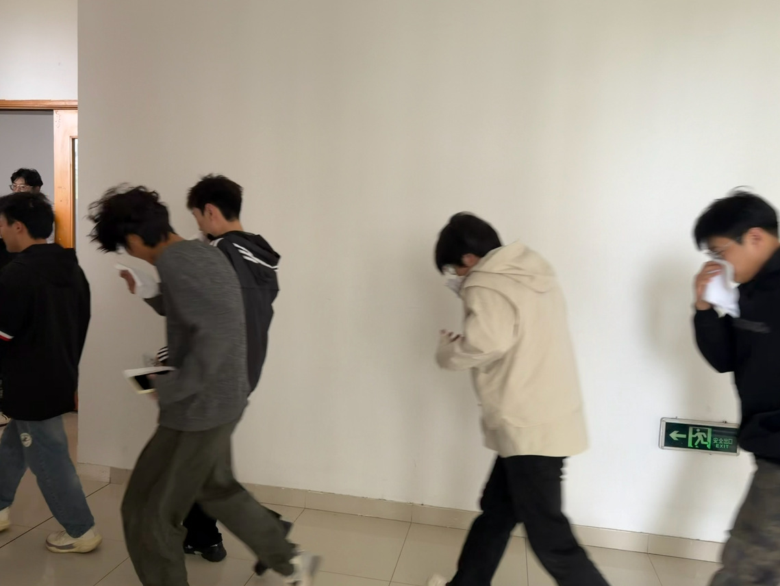 随着火警警报响起,演练正式进入疏散环节。师生们沉着应对,用湿毛巾捂住口鼻,弯腰低姿、紧贴墙根,沿预设路线快速、有序撤离,顺利抵达指定安全区域。本次演练参演人员全部安全撤离,流程顺畅、组织高效,达到预期效果。