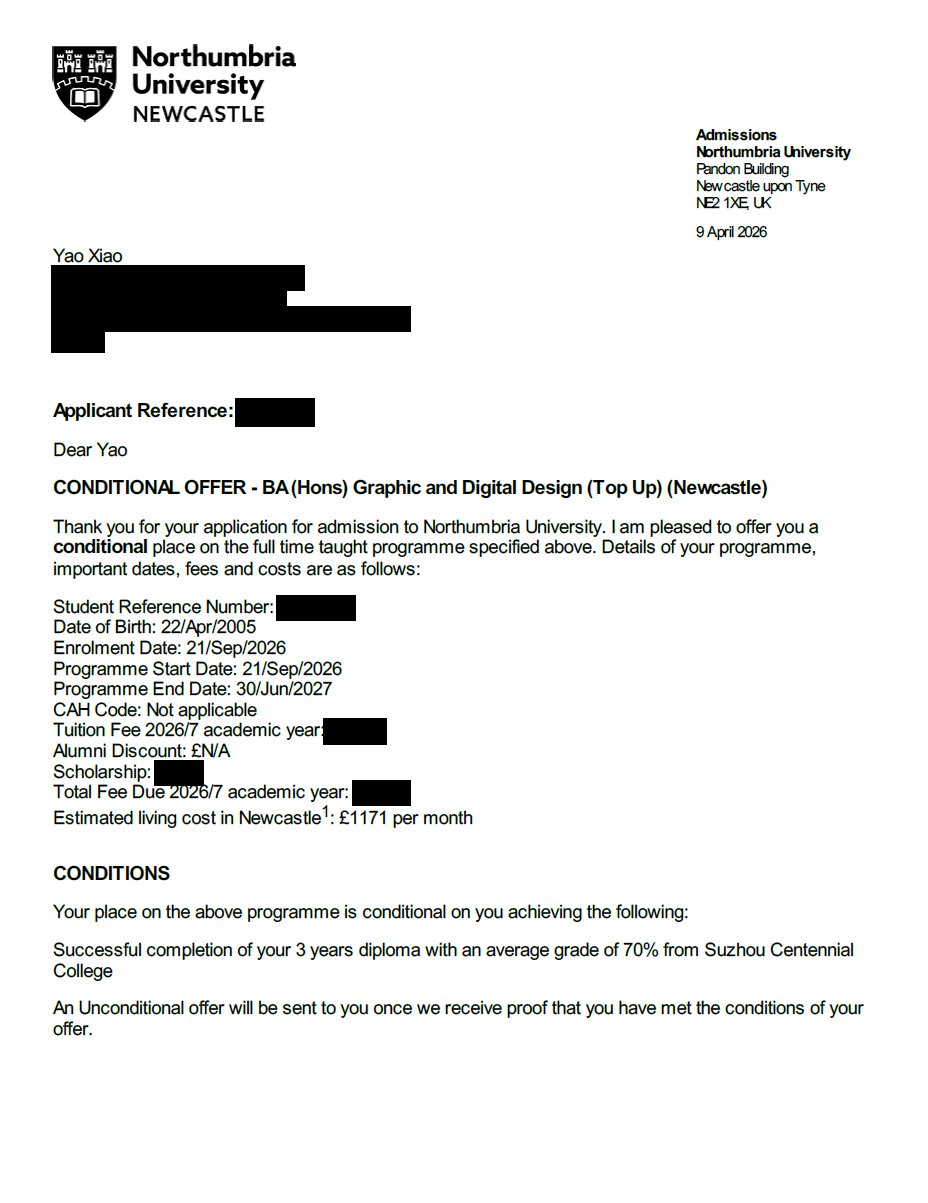 英国诺桑比亚大学位于英格兰纽卡斯尔,是一所具有较高国际声誉的综合性大学。其艺术与设计学科在英国乃至全球都颇具影响力,是众多设计学子向往的学术殿堂。该校的BA (Hons) Graphic and Digital Design (Top Up)项目独具特色,它巧妙地将传统平面设计与数字媒体、交互设计等前沿领域相结合,注重培养学生的实践能力、创新意识和国际视野。对于肖瑶来说,获得这所名校的预录取资格,意味着她将有机会进入一个更高水平的学术平台,接触国际设计前沿理念和先进技术,进一步提升自己的专业素养,为未来在国际设计领域的发展奠定坚实基础。