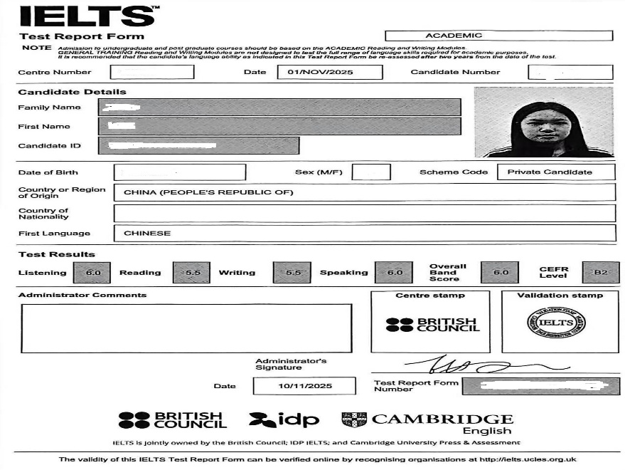 在为海外升学做准备的过程中,肖瑶更是展现出了强大的自律和坚韧。她合理规划时间,在保证专业学习不落下的同时,系统备考雅思。最终,她以总分6.0且各单项不低于5.5的优异成绩,证明了自己在英语应用方面的出色能力,为申请英国高校增添了关键的筹码。